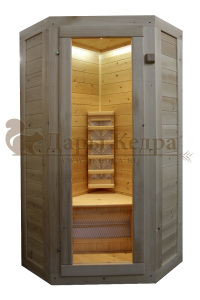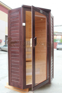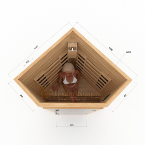 Это специально оборудованная кедровая кабина для прогрева тела человека сухим теплом. Воздух в таких парных не нагревается. Инфракрасные лучи воздействуют на тело, равномерно прогревая мышцы, суставы и органы. Керамические излучатели похожи на лампы, имеют высокую температуру нагрева, поэтому защищены противоожоговыми решетками. Тело человека в таких саунах нагревается интенсивнее. Работает кабина за счет электричества. Установка сауны в угол, позволяет рационально использовать пространство помещения. Подходит как для домашнего использования, так и для коммерции.
